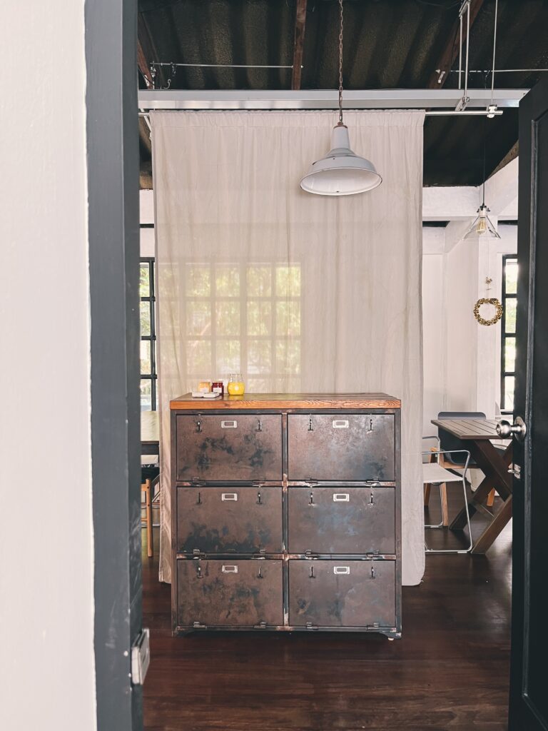 一上來二樓,眼前的老件鐵櫃搶占了所有目光。喜歡它擺放的位置,以及後面垂放的布簾營造出的空間區隔感。