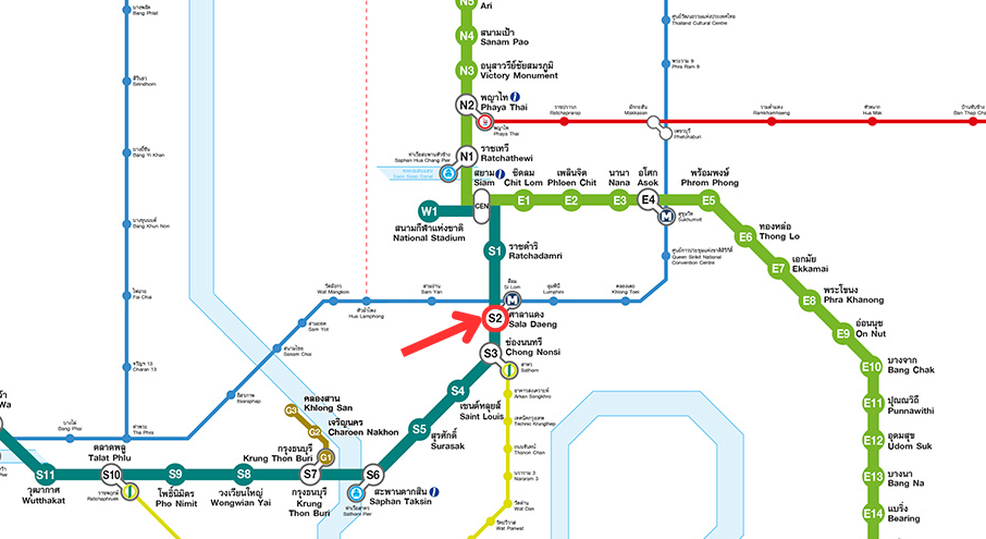 若是搭乘捷運前往,我們比較常用的方式是搭到BTS Sala Daeng站,出站步行約11分鐘。BTS Sala Daeng站是位在空鐵的深綠色Silom線上。若從市中心的鬧區過來,從最熱鬧的大站Siam站(淺綠色蘇坤蔚線Sukhumvit Line)轉乘兩站就抵達。
