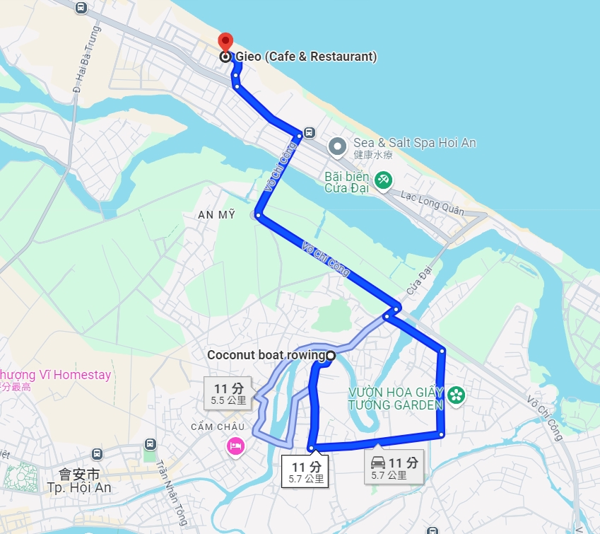 Gieo Cafe地理位置靠近安邦海灘(An Bang Beach),距離Coconut Boat的乘船處並不遠,約六公里,開車10分鐘左右即抵達。因此搭乘完椰子船後,我們就請當天包車的司機送我們過去。結束後再從Gieo Cafe到會安古鎮也是差不多10分鐘。