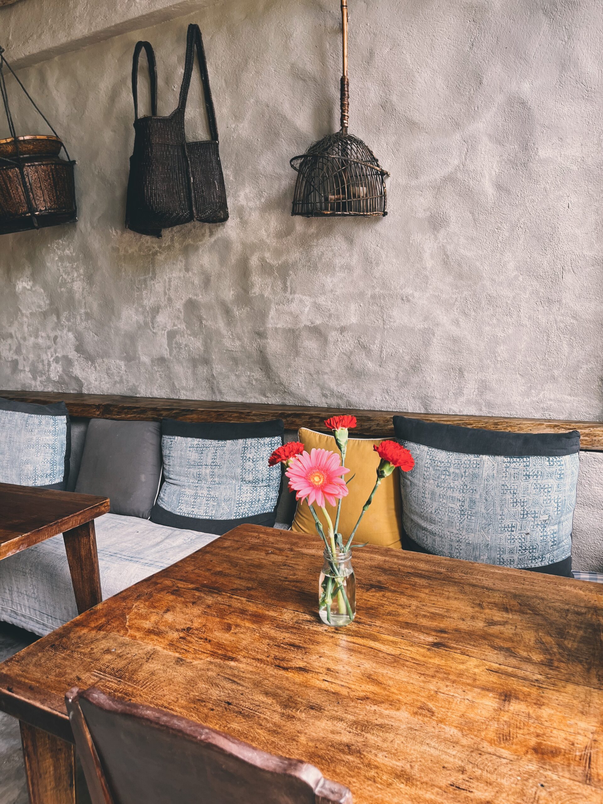 Gieo Cafe室內的裝設極美,每一個小角落都有著小巧思。桌面的花草、餐盤擺設、抱枕配色等等,構成的畫面素雅且詩意。整體空間不大,卻處處是風景。