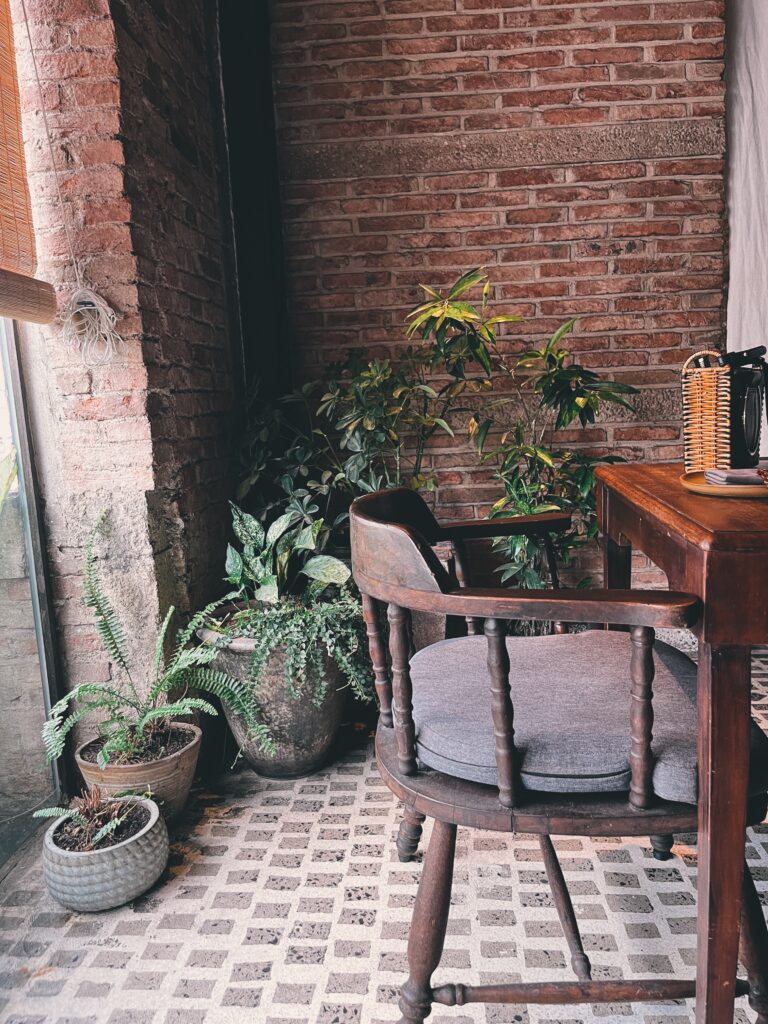 餐廳使用的桌椅也十分講究,整體的氛圍感建構的很好。陽光灑進室內的角度,讓紅磚牆透著復古感。一旁的綠植讓拍攝起來的畫面一點也不單調。
